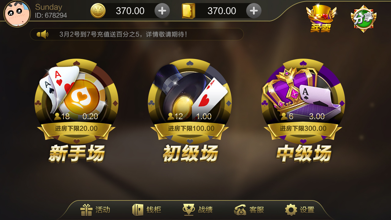 2.玩法多变:分别有初中高级场,私人场,娱乐场,百人场等游戏模式